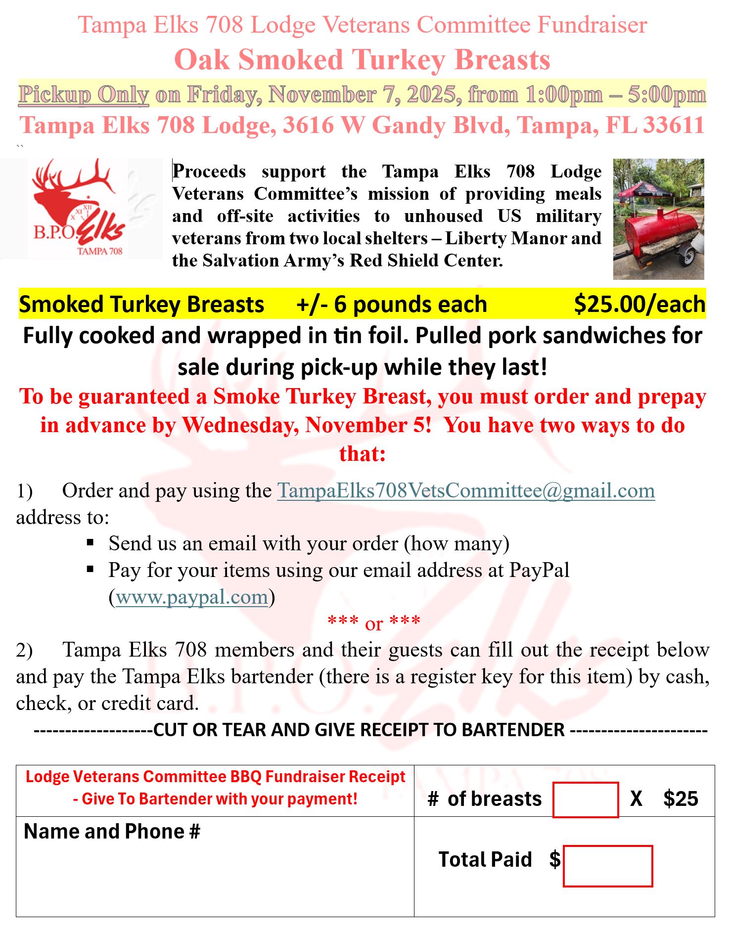 Order your Breasts by emailing Chris Ragusa at TampaElks708VetsCommittee@gmail.com Pay for your order at www.paypal.com to the same email address. FUNDRAISER - ORDER AND PAY NOW - THANK YOU!!!